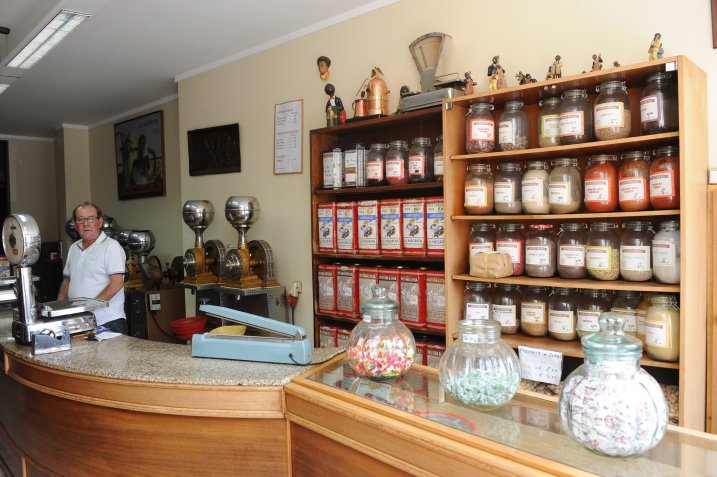 A loja mantém o seu aspeto tradicional, exibindo os ‘velhinhos’ moinhos, as balanças, as caixas e os frascos, os quadros e as esculturas de origem africana.