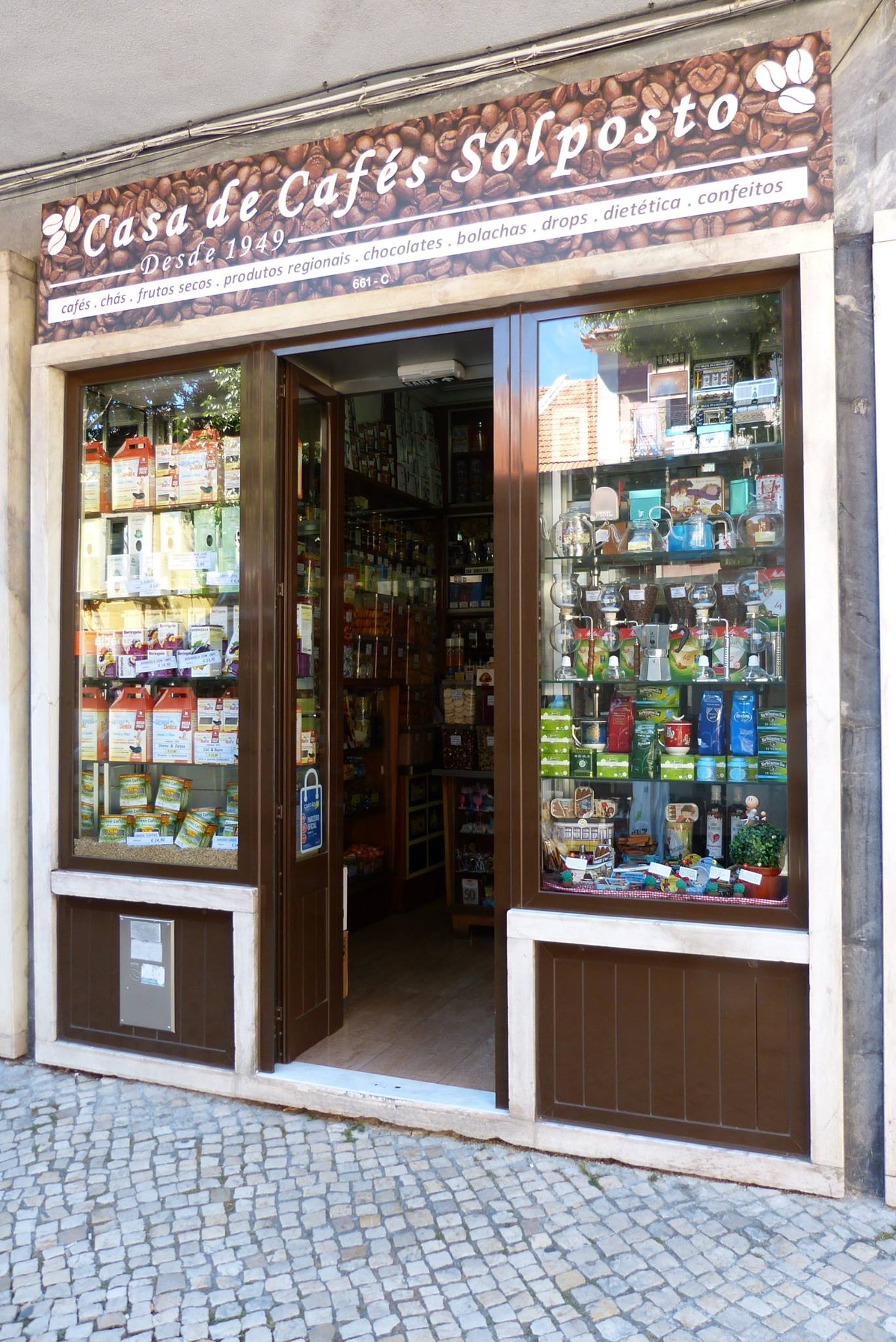 Esta pequena loja encontra-se praticamente como na origem. Balcão em madeira e vidro e paredes revestidas a estantes em madeira com envidraçados, totalmente preenchidas pelos produtos disponiveis para venda. Na zona inferior as gavetas armazenam os lotes de café.